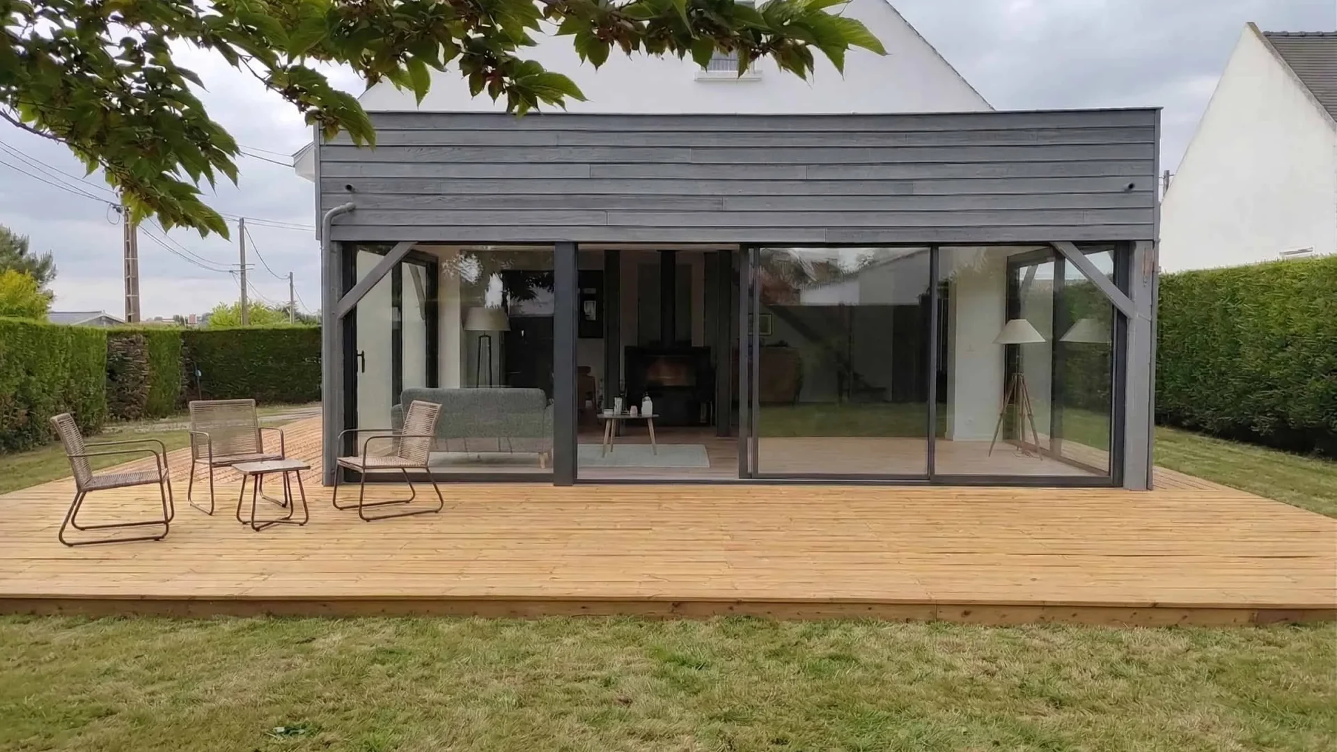 Nous avons élargi les ouvertures, unifié l’espace entre la véranda et la maison, et marqué le passage par une cheminée centrale. Une terrasse, dans le prolongement, achève le lien.