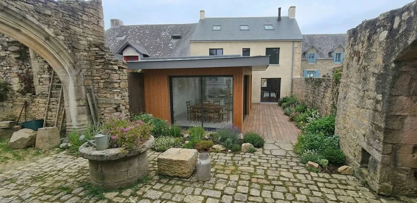 Au cœur du village de Piriac-sur-Mer, cette maison de pêcheur s’élève sur le site d’une ancienne chapelle du XVIᵉ siècle. Les siècles y ont laissé leurs traces, superposant transformations et ajouts jusqu’à former un véritable millefeuille d’époques. Le projet choisit de composer avec cet héritage : restaurer avec soin ce qui appartient au passé et assumer l’écriture d’une extension d’aujourd’hui. Glissée entre la maison et la chapelle Saint-Fiacre, l’intervention devient un trait d’union contemporain entre deux monuments du temps. Ouverte largement vers l’extérieur, elle offre un espace à la fois habité et contemplatif.